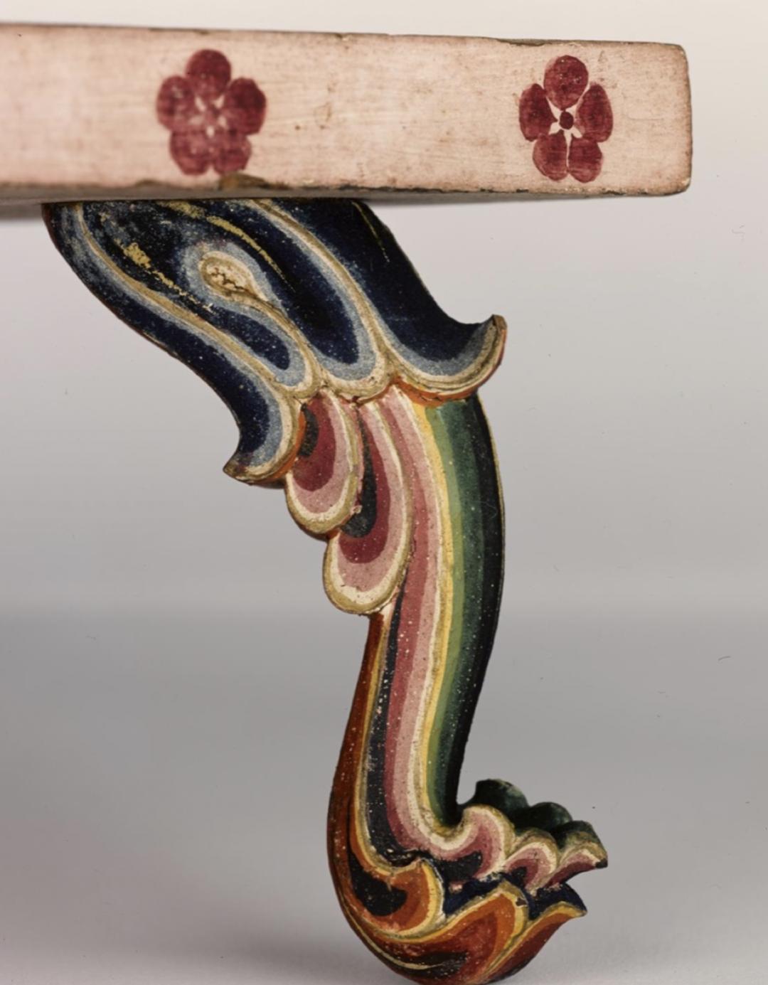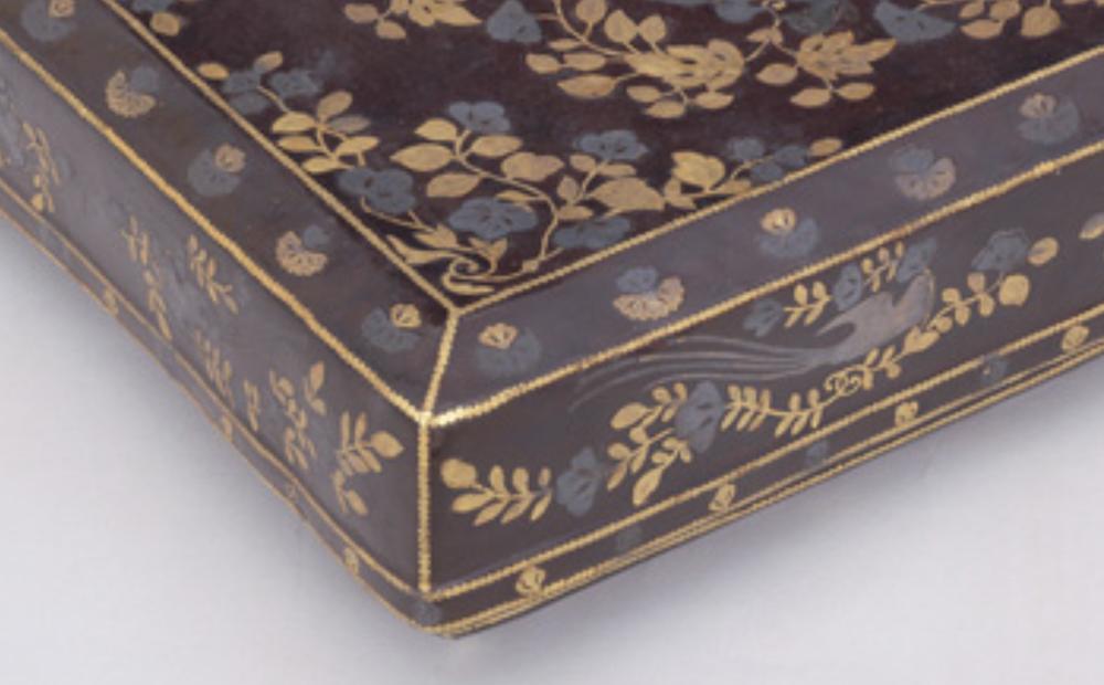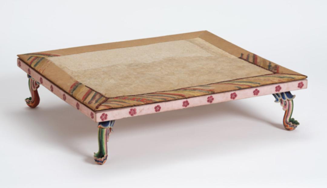 這是祭臺(tái)前供品的幾案,附有與桌面大小相同的幾褥。桌面由單片柏木制成,并有一個(gè)葉子形狀的花紋,層次感引人注目。根據(jù)頂板背面的墨跡和貼紙,該幾案在入藏正倉院前,供奉著千手觀音菩薩像和鎏銀佛像,原屬于東大寺千手堂。