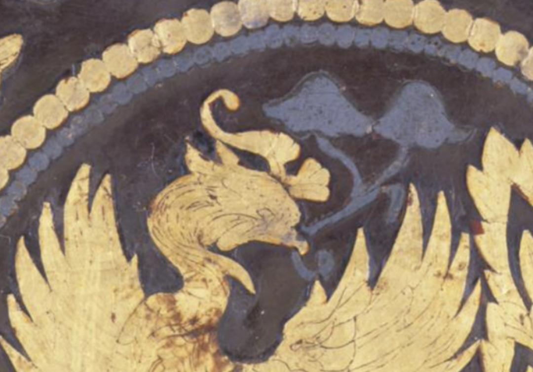 這是一對(duì)用細(xì)扁柏木切成飛鳥形狀的薄片,曾經(jīng)被認(rèn)為是一種水禽的象征。但此后的研究中認(rèn)為,飛鳥頭上獨(dú)特的冠羽,以及有著黑白條紋的翅膀,表明其很可能是一種飛禽。但它已被確定為頭上有獨(dú)特的冠羽,翅膀上有黑白條紋的戴勝。此外,冠部、翅膀和尾巴上覆蓋著水平條紋的松鴉原色,以及一小片金箔。做工精細(xì),很可能是衣服上的裝飾品。