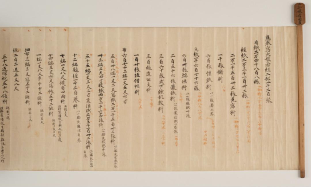 這是受委托而進(jìn)行的《大般若經(jīng)二部一千二百卷》抄經(jīng)活動(dòng),所用原材料的詳細(xì)記錄。在唐朝,抄經(jīng)是一個(gè)職業(yè),大多由朝廷組織,分為官方寺院和僧人抄經(jīng)、官方佛經(jīng)抄寫機(jī)構(gòu)抄寫佛經(jīng)以及地方政府抄經(jīng)三類。由此不難看出,在唐朝,部分抄經(jīng)人很可能是公務(wù)員。