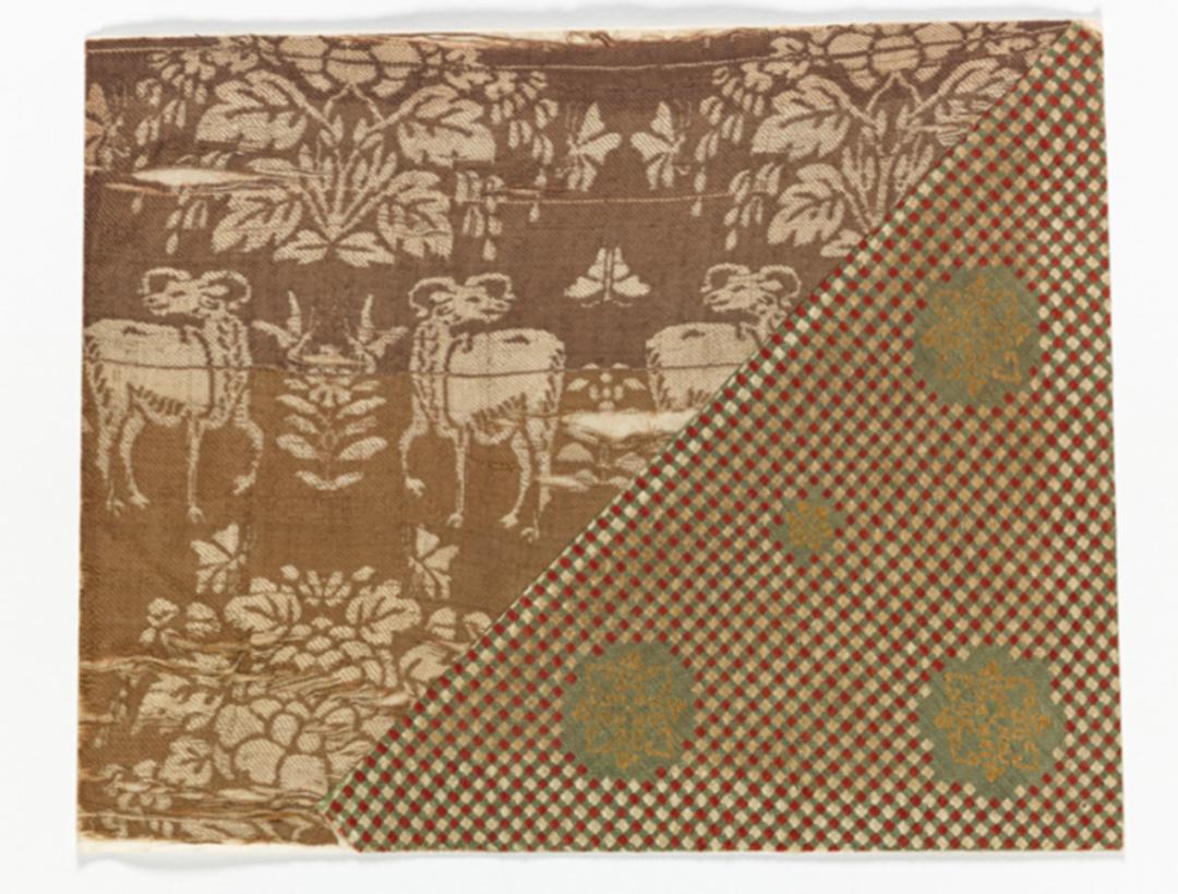 這塊染色織物取自東大寺屏風(fēng),原與屏風(fēng)粘連。1833年,正倉院寶庫開館時(shí),曾按照織物的內(nèi)容將屏風(fēng)拼貼起來,后稱東大寺屏風(fēng)。這次開封是對(duì)正倉院的織染品的第一次全面整理,具有重大意義。后東大寺屏風(fēng)為蟲害破壞,于1951年起,歷時(shí)3年拆除,該染色織物和屏風(fēng)的底布料分別保管。