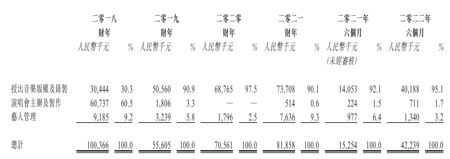 從風(fēng)華秋實的幾個業(yè)務(wù)板塊來看,2018年至2021年,公司來自授出音樂版權(quán)及錄制的收入一路從3044萬上漲至7371萬,保持持續(xù)上漲的態(tài)勢,且在2019年之后,便一躍成為營收貢獻超九成的核心支柱業(yè)務(wù),而支撐這一業(yè)務(wù)的重要客戶為音樂平臺。