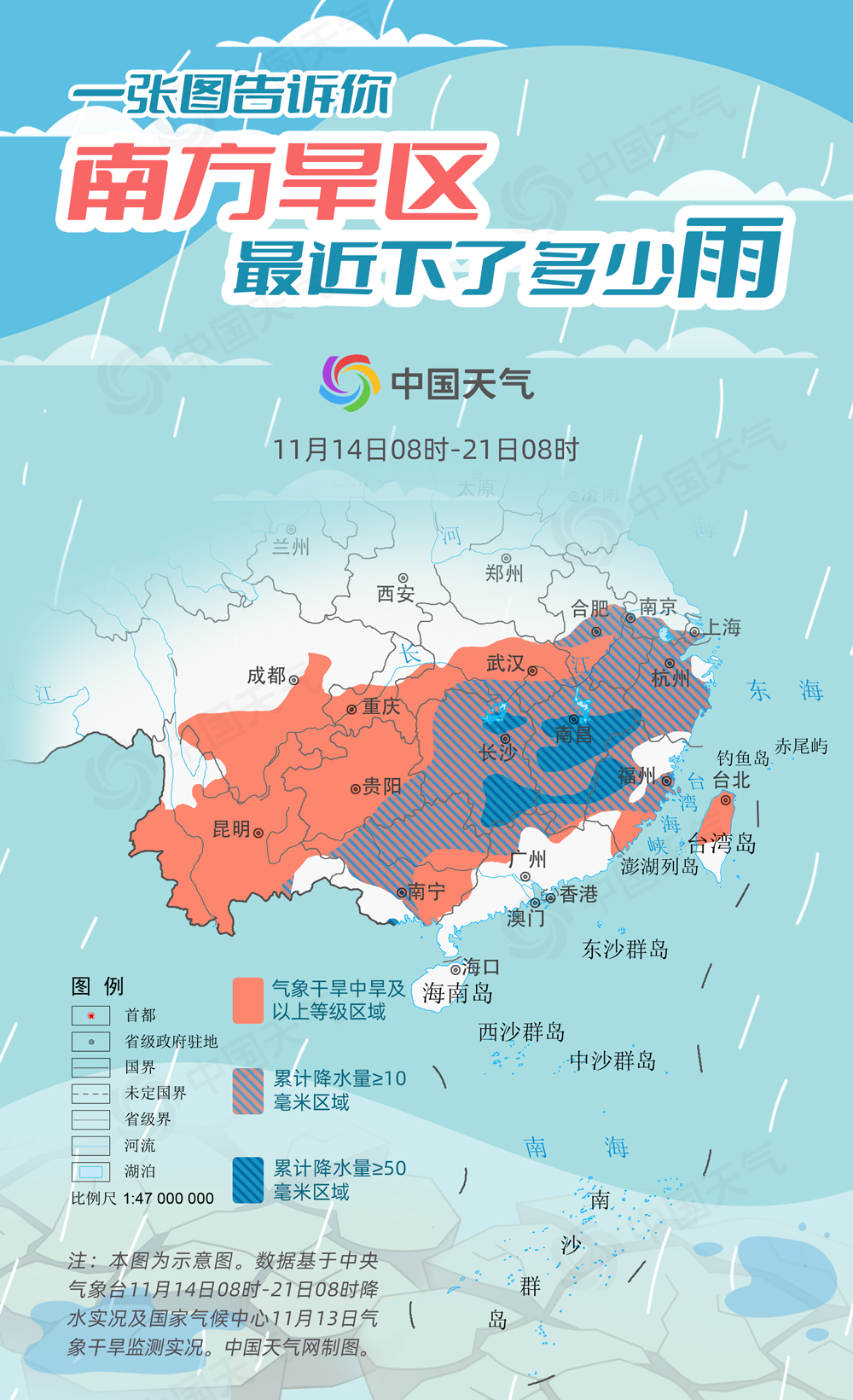 久旱逢甘霖!上周,一直持續(xù)氣象干旱的江南、華南等地終于接連迎來了兩輪降水過程。在雨水的滋潤下,當(dāng)?shù)貧庀蟾珊档玫搅嗣黠@緩解,中央氣象臺也在11月16日解除了連續(xù)發(fā)布90天的氣象干旱預(yù)警。那么,最近南方下了多少雨?中國天氣網(wǎng)用一張圖告訴你答案。