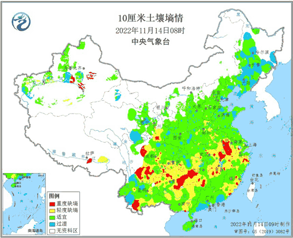 而從中央氣象臺發(fā)布的10厘米土壤墑情監(jiān)測圖也可以看到,與11月14日相比,今天南方重度缺墑和輕度缺墑的面積也大大縮減。