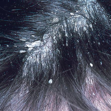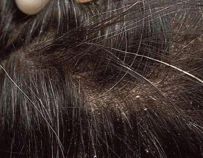 主要表現(xiàn)為厚實皮屑堆積并緊密黏附于頭皮和頭發(fā)上,強行去除皮屑可拔出頭發(fā)。