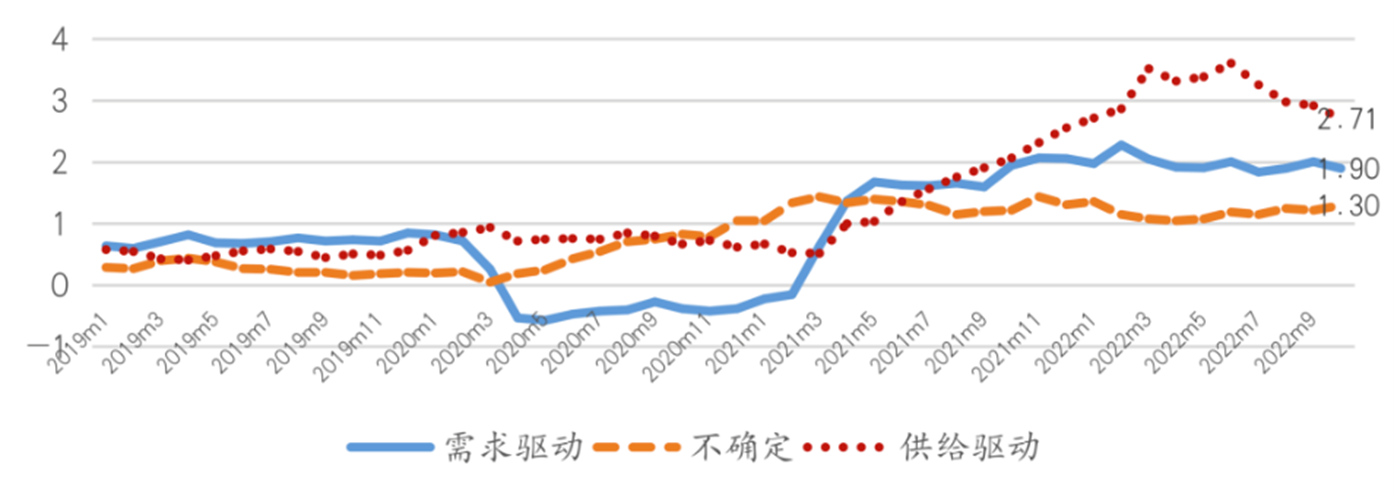 從美國的PCE看,從今年6月份開始,供給沖擊在通脹中構(gòu)成的重要性明顯下降,由6月份的3.61個(gè)百分點(diǎn)下降至10月份的2.71個(gè)百分點(diǎn);而需求驅(qū)動(dòng)的重要性要穩(wěn)定的多。