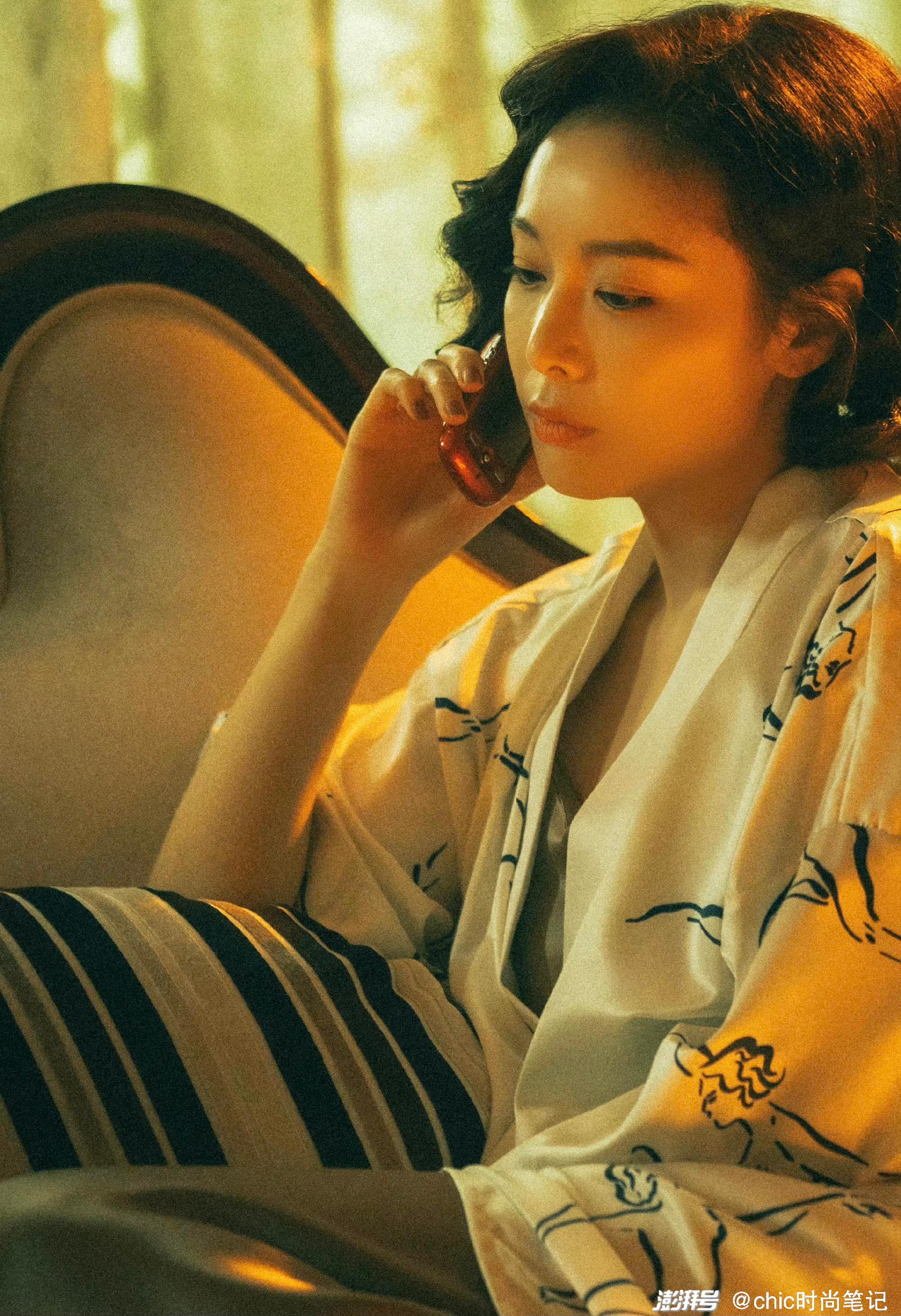 在陳書婷的造型中,讓我們感嘆中年女人的成熟與性感。一套白色印花家居服褪去了平時的囂張,微眸輕竟有一種知性的柔弱美感。