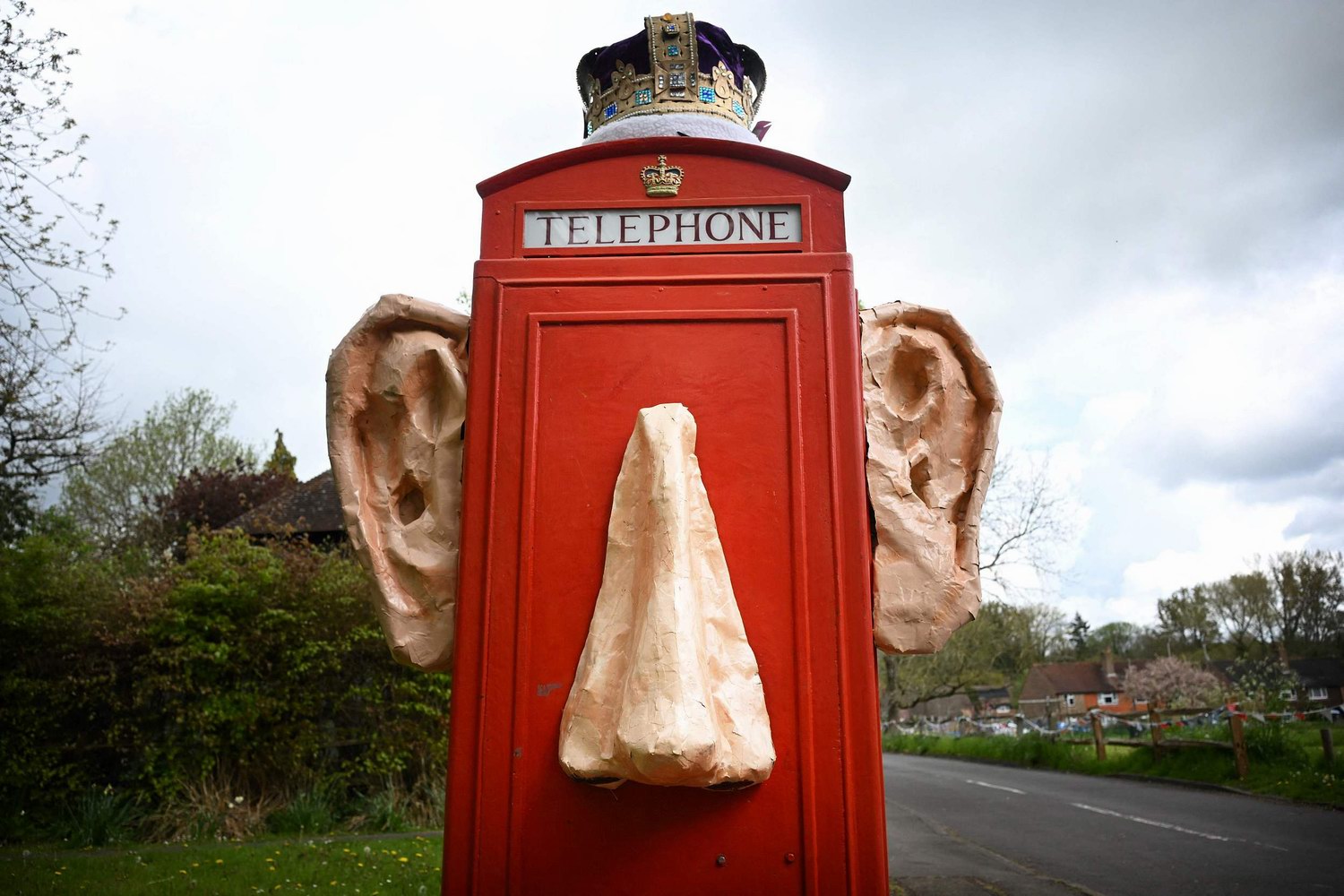當?shù)貢r間2023年5月5日,英國倫敦,薩里郡的康普頓村,一個翻新的電話亭裝飾著國王查爾斯三世的耳朵和王冠。英國將于2023年5月6日為英國國王查爾斯三世和他的妻子英國王后卡米拉舉行加冕禮。