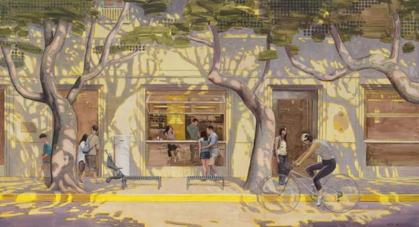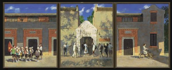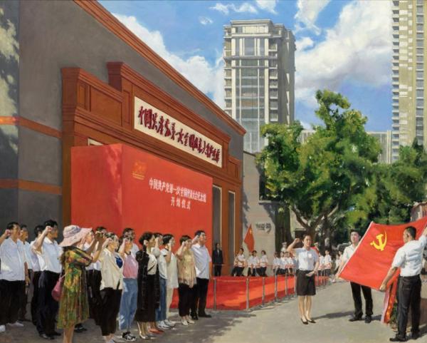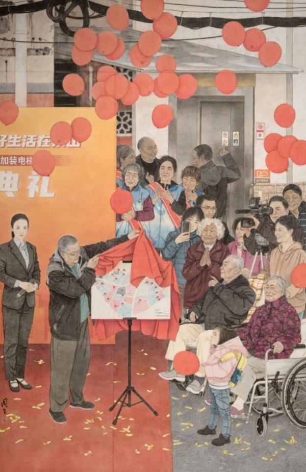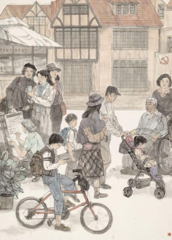 人民城市的發(fā)展故事是中國(guó)式現(xiàn)代化的生動(dòng)縮影。參與此次項(xiàng)目創(chuàng)作的藝術(shù)家,歷經(jīng)調(diào)研、采風(fēng)、蹲點(diǎn),用獨(dú)特的視角捕捉城市角落,將人們的生活場(chǎng)景、情感體驗(yàn)和城市的發(fā)展變化融為一體。在展廳中可以看到,作品中有不少巧思構(gòu)想,如選取對(duì)話的視角展現(xiàn)城市之變的《中共一大紀(jì)念館開館》《中共二大會(huì)址紀(jì)念館重新開館》《跨越時(shí)空的信——龍華革命烈士紀(jì)念地之送新兵》等,并沒有采取以往主題性創(chuàng)作單純描繪歷史建筑或者歷史事件的視角,而是把當(dāng)下人的活動(dòng)與煥新的歷史建筑結(jié)合在一起,更能引起觀眾的共鳴?!缎茏Х取酚妙H具創(chuàng)意的九宮格構(gòu)圖形式,還原了人們看到熊爪咖啡后的拍照打卡瞬間;《中華藝術(shù)宮10年再出發(fā)》巧妙地隱藏了中外觀眾最為關(guān)注、爭(zhēng)相觀看的作品,保留了想象的空間;描繪保租房建設(shè)的《此處心安是吾家》,以大幅三聯(lián)畫的形式,用建設(shè)中的樓群占滿整個(gè)畫面,體現(xiàn)了保租房項(xiàng)目的規(guī)模之大,大面積的黃色和綠色對(duì)比,區(qū)分了已經(jīng)完工的樓棟與正在建設(shè)中的樓棟;《梧桐樹下鄰里匯》《幸福加速度》《人間重晚晴》等以人物為主要描繪對(duì)象的作品,畫面人物眾多,但不同年齡段、不同性格的人物特征躍然紙上。