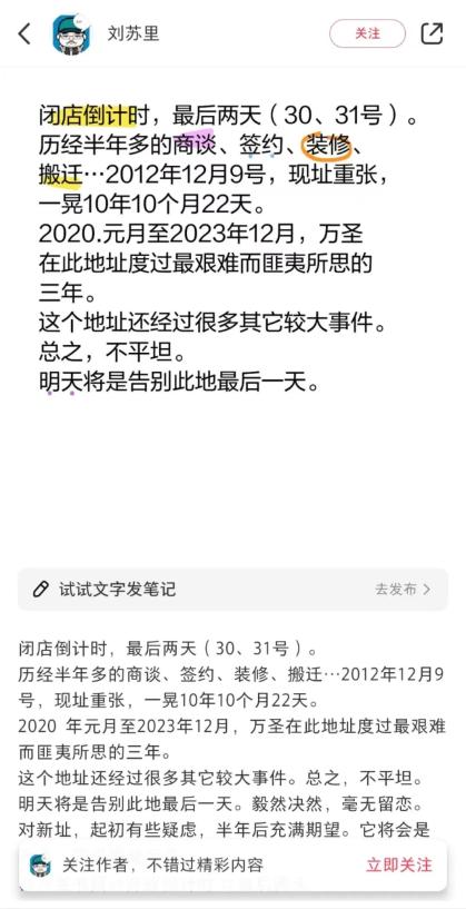 萬圣書園創(chuàng)始人劉蘇里今天在小紅書發(fā)布信息稱: