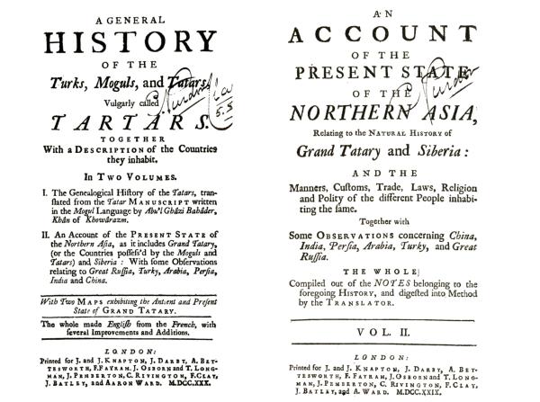 阿卜而嘎錫(Abul Ghazi Bahader Khan)的《突厥、蒙兀兒和韃靼通史》(A General History of The Turks, Moguls, and Tatars),1730年倫敦出版的英文譯本,分兩卷。該書即中文譯本《突厥世系》,實(shí)際上是蒙古史。來源:作者提供