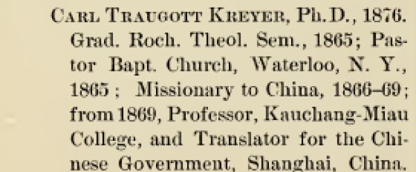 《1850-1879年羅切斯特大學(xué)師生名錄》(General catalogue of the officers and alumni and of the honorary graduates of the University of Rochester, 1850-1879,1979年出版,第30頁,1863年畢業(yè)欄目中,有金楷理(Carl Traugott Kreyer),注明其時(shí)任上海政府譯員。來源:作者提供