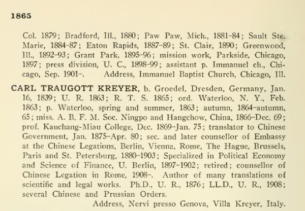 1910年出版的《羅切斯特神學(xué)院師生名錄 1850- 1910年》中,金楷理的簡歷頗詳,注明其在1880-1903年任中國駐柏林、維也納、羅馬、海牙、布魯塞爾、巴黎和圣彼得堡參贊。1897-1902年間,在柏林大學(xué)專修政治經(jīng)濟(jì)學(xué)和財(cái)政學(xué)。退休。1908年后任中國駐羅馬公使館參贊。1876年獲得羅切斯特大學(xué)哲學(xué)博士學(xué)位,1908年獲得法學(xué)博士學(xué)位。最后是他的住址,在意大利熱那亞。