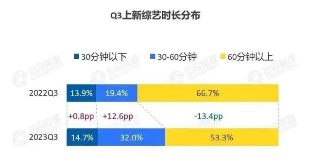 據(jù)云合數(shù)據(jù)《2023年Q3綜藝網(wǎng)播表現(xiàn)及用戶分析報告》,去年Q3集均時長60分鐘以下的季播綜藝共上新35部,較去年同期增長11部。其中,30-60分鐘的綜藝部數(shù)占比同比增加12.6%。