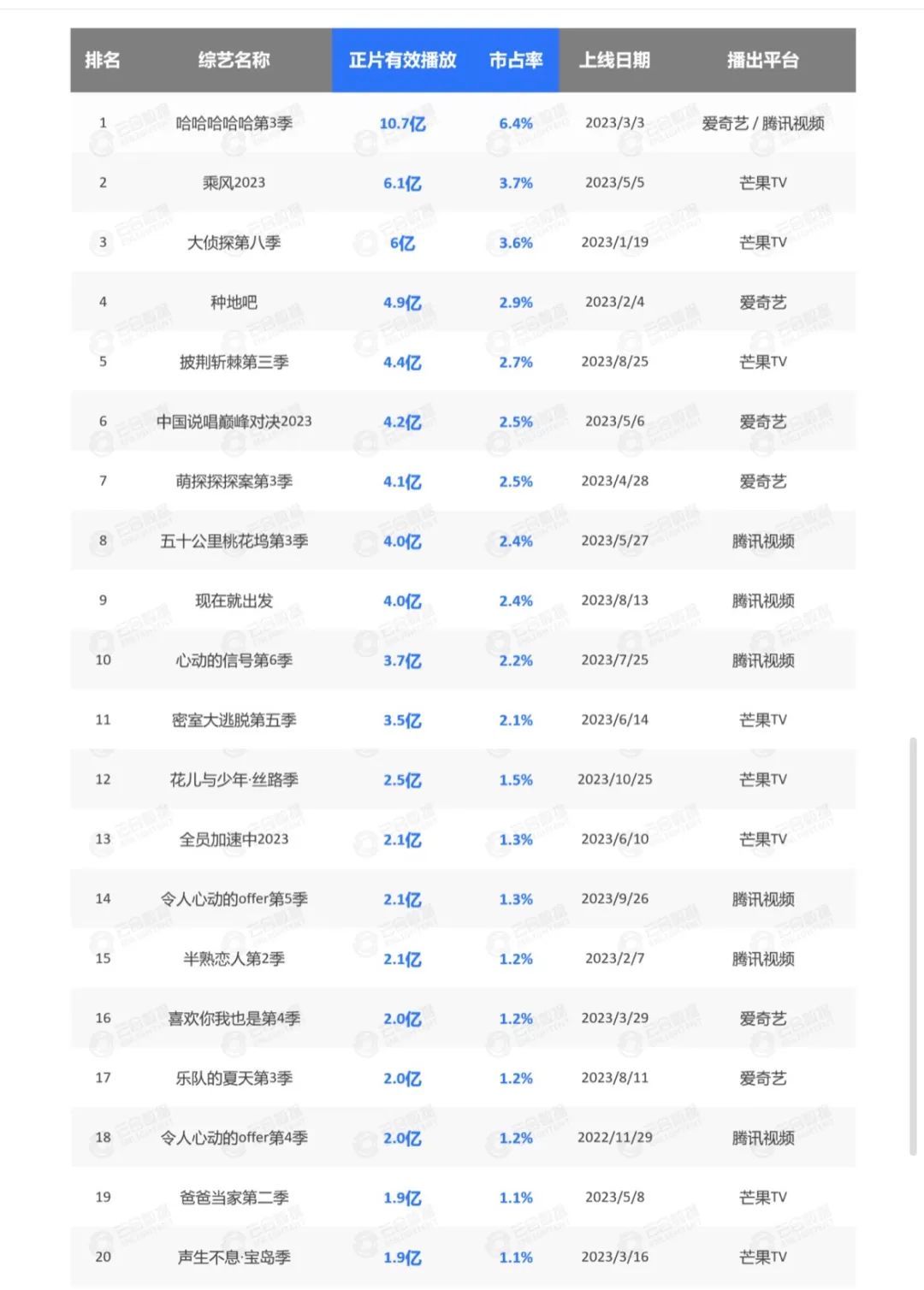 云合數(shù)據(jù)2023年網(wǎng)綜有效播放榜單