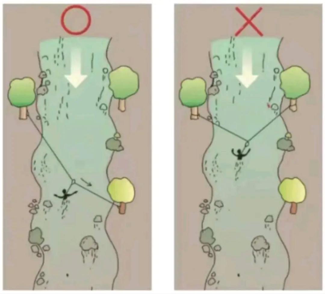 正確的渡河繩索應(yīng)該有距離落差,以避免形成“死亡V字”