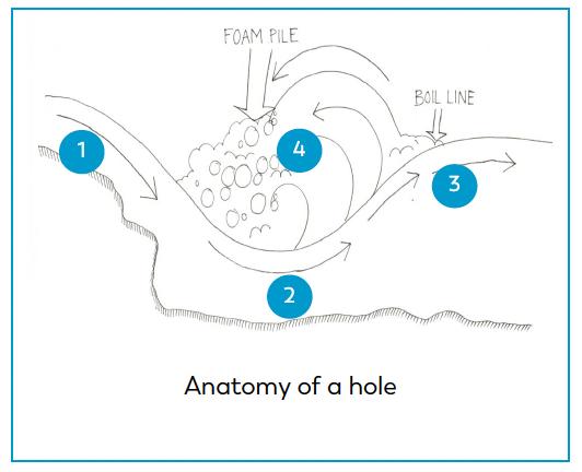在滾水壩地形中,表層的水流會被沖回上游,這會讓被卷入沸騰線的物體被困在滾水的中心無法逃離,這種情況非常危險,掙扎并不能幫助逃離,只會讓人迅速耗盡體力或者嗆入更多的水,最終溺水。