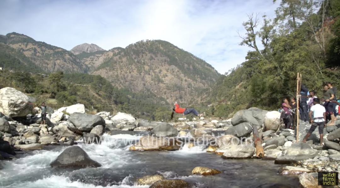 遠離河面的繩索是安全可靠的渡河手段,不想自己抓著過可以讓對面的人拿繩子拉一下,無痛過河|WildFilmsIndia