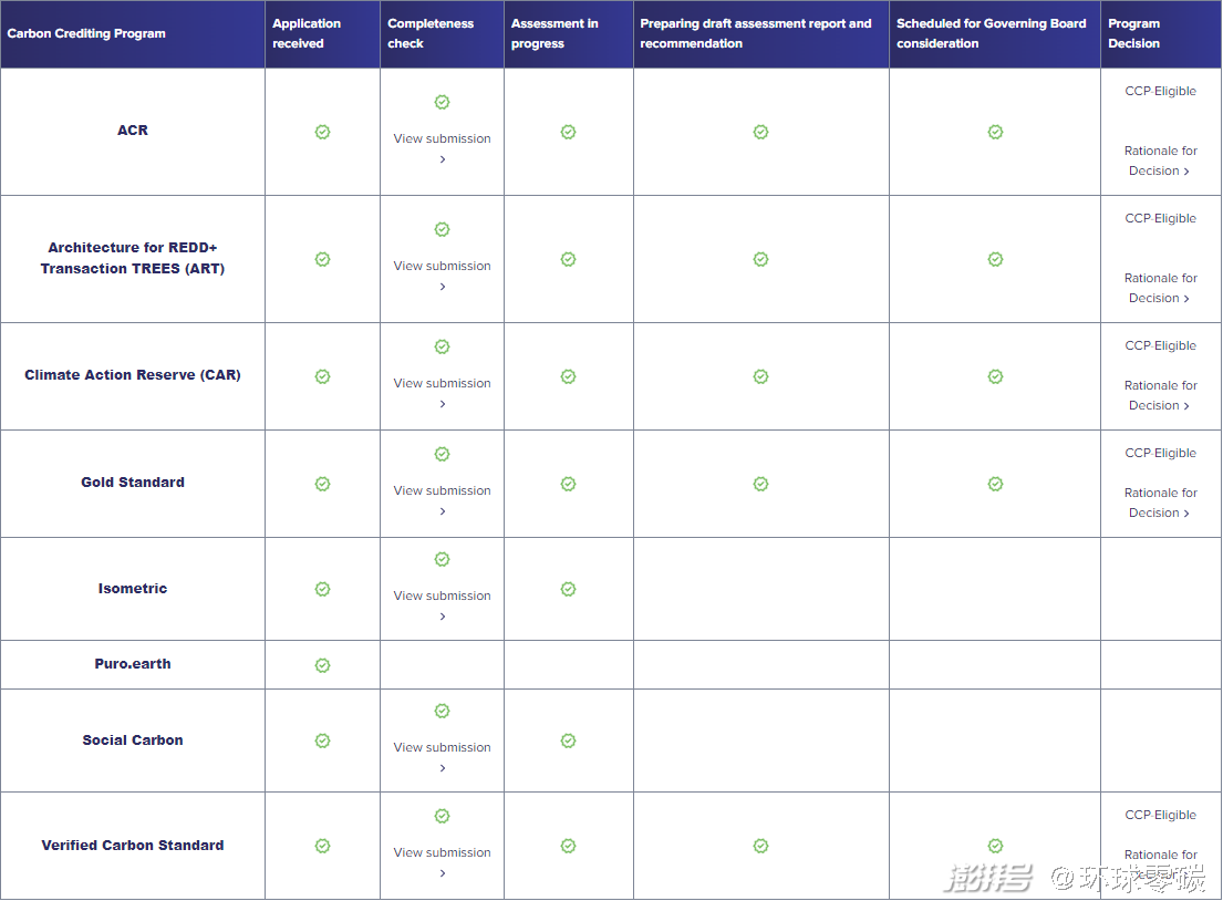 目前,通過ICVCM初步審批的碳信用計(jì)劃,分別有美國碳登記(ACR)、氣候行動(dòng)儲(chǔ)備(CAR) 、黃金標(biāo)準(zhǔn)(GS)、核證碳標(biāo)準(zhǔn)(VCS)和REDD+交易構(gòu)架(ART)。另外還有幾個(gè)小型碳信用計(jì)劃正在審批中。