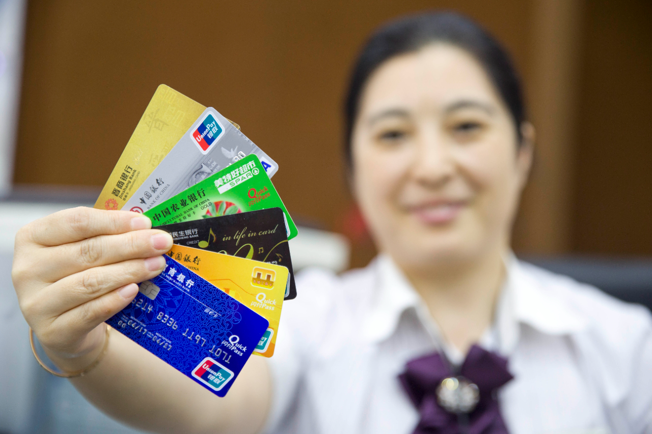 資料圖為銀行工作人員正在展示銀行卡。(圖片由CNSPHOTO提供)