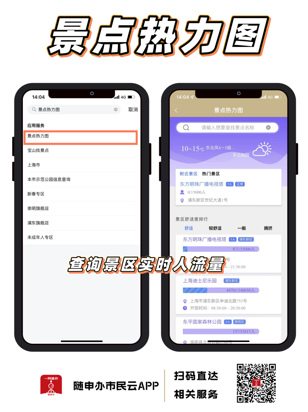 “隨申辦市民云”APP【景點(diǎn)熱力圖】服務(wù),可查詢上海部分景區(qū)實(shí)時(shí)客流量,幫助您錯(cuò)峰出游。