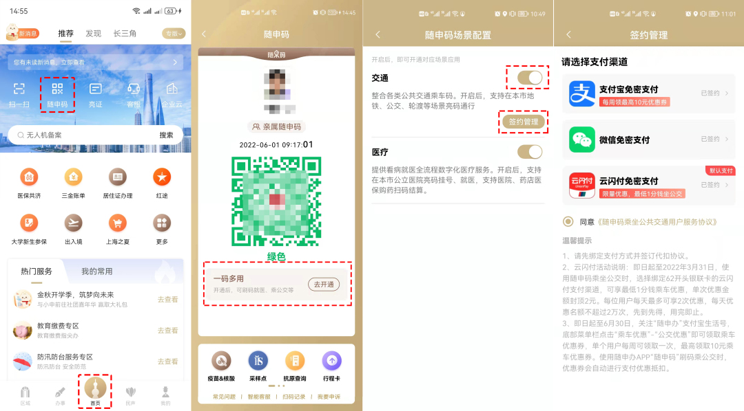 在上海乘公交、地鐵、輪渡,換乘無(wú)需來(lái)回切換APP、乘車(chē)碼,市民朋友們可刷已開(kāi)通“隨申碼”交通場(chǎng)景的“隨申碼”乘坐本市全線軌道交通(含磁懸?。?、地面公交、輪渡(含三島客運(yùn))等公共交通工具