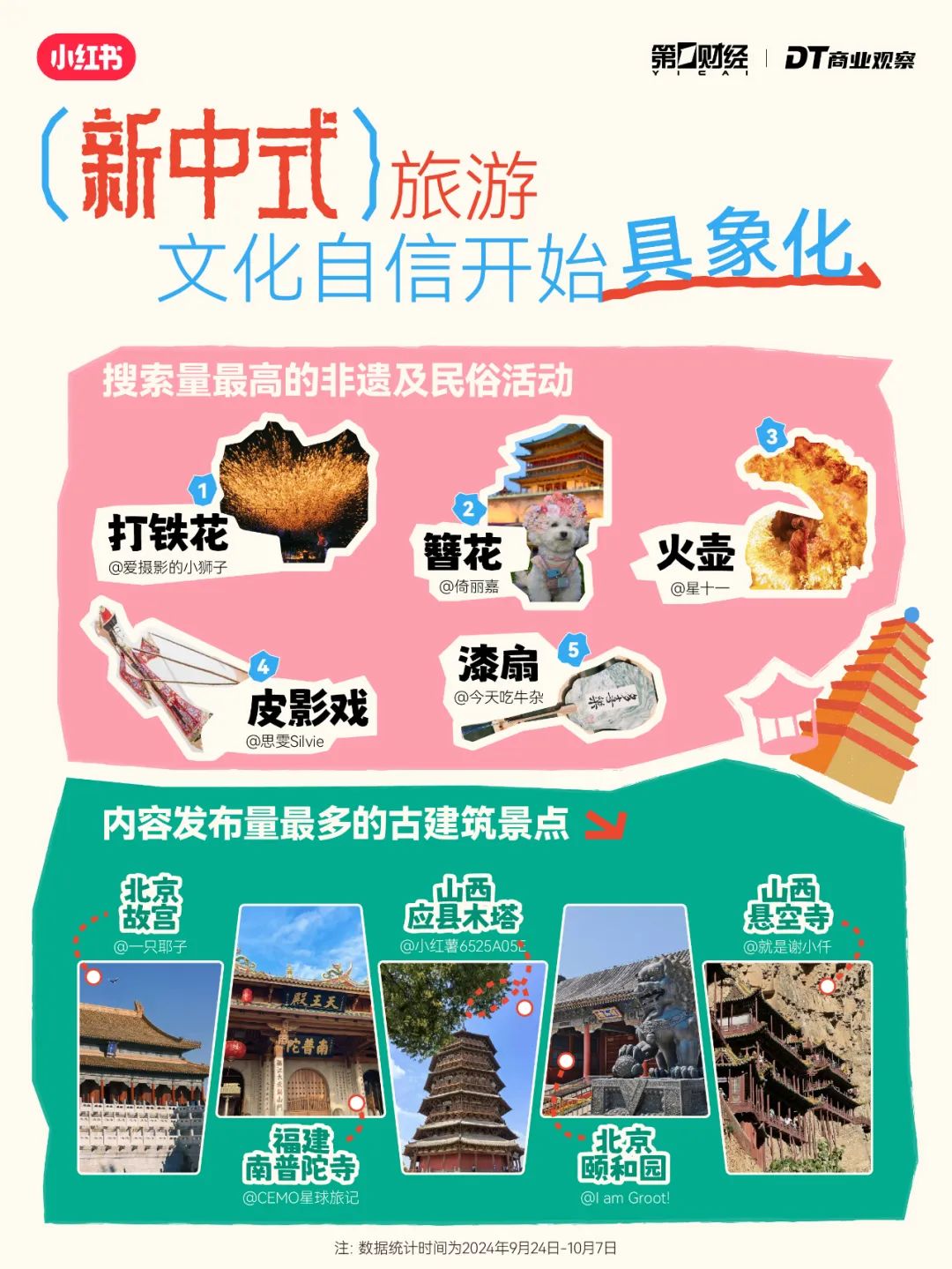 以升旗儀式、福州愛心樹、迪士尼國慶特別版煙花秀為代表的當代城市風景,以雪后賽里木湖為代表的原生態(tài)自然風光,以小西天為代表的傳統(tǒng)古建筑,都在小紅書迎來了自己的高光時刻。