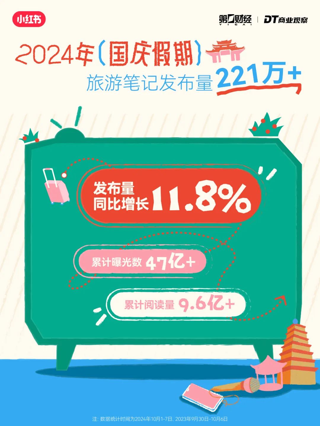 2024年國慶假期,小紅書上旅游筆記發(fā)布量221萬+,同比增長11.8%,累計曝光量47億+,累計閱讀量9.6億+。