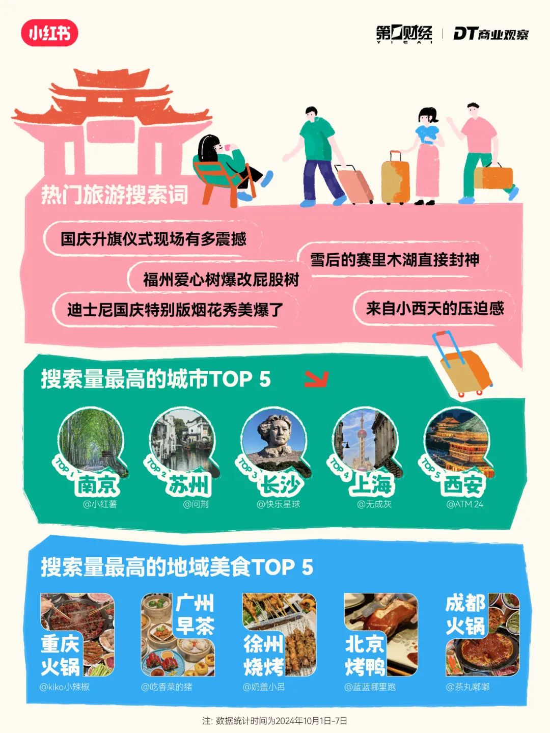 DT商業(yè)觀察和小紅書一起,根據(jù)2024年國慶期間小紅書用戶站內(nèi)出行旅游相關(guān)的發(fā)帖及搜索數(shù)據(jù),洞察了6個值得回味的國慶逛吃趨勢,總結(jié)為一份小紅書國慶逛吃報告。