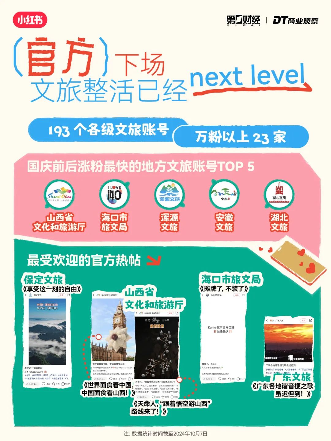 截至今年國慶假期,小紅書上官方文旅局的入駐數(shù)量從年初的40家增至193家,其中萬粉以上賬號23家,千粉以上多達90家。