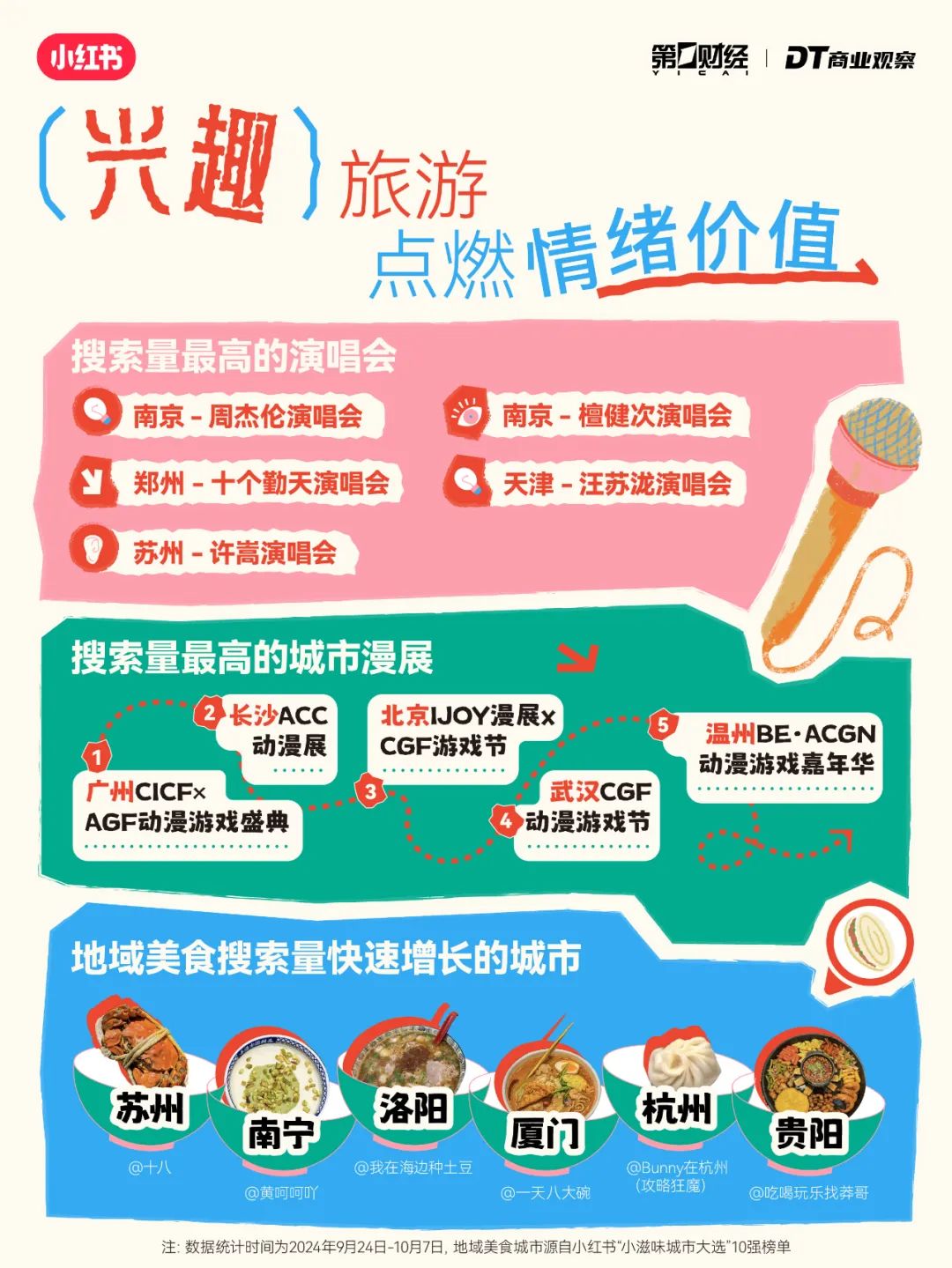 有人為十個勤天演唱會奔赴鄭州,順便在小紅書上種草了胡辣湯;有人節(jié)前在天津聽汪蘇瀧演唱會,跟著攻略打卡了瓷房子、五大道;還有人去蘇州聽許嵩演唱會,被當?shù)毓沤中∠锼?,流連忘返。