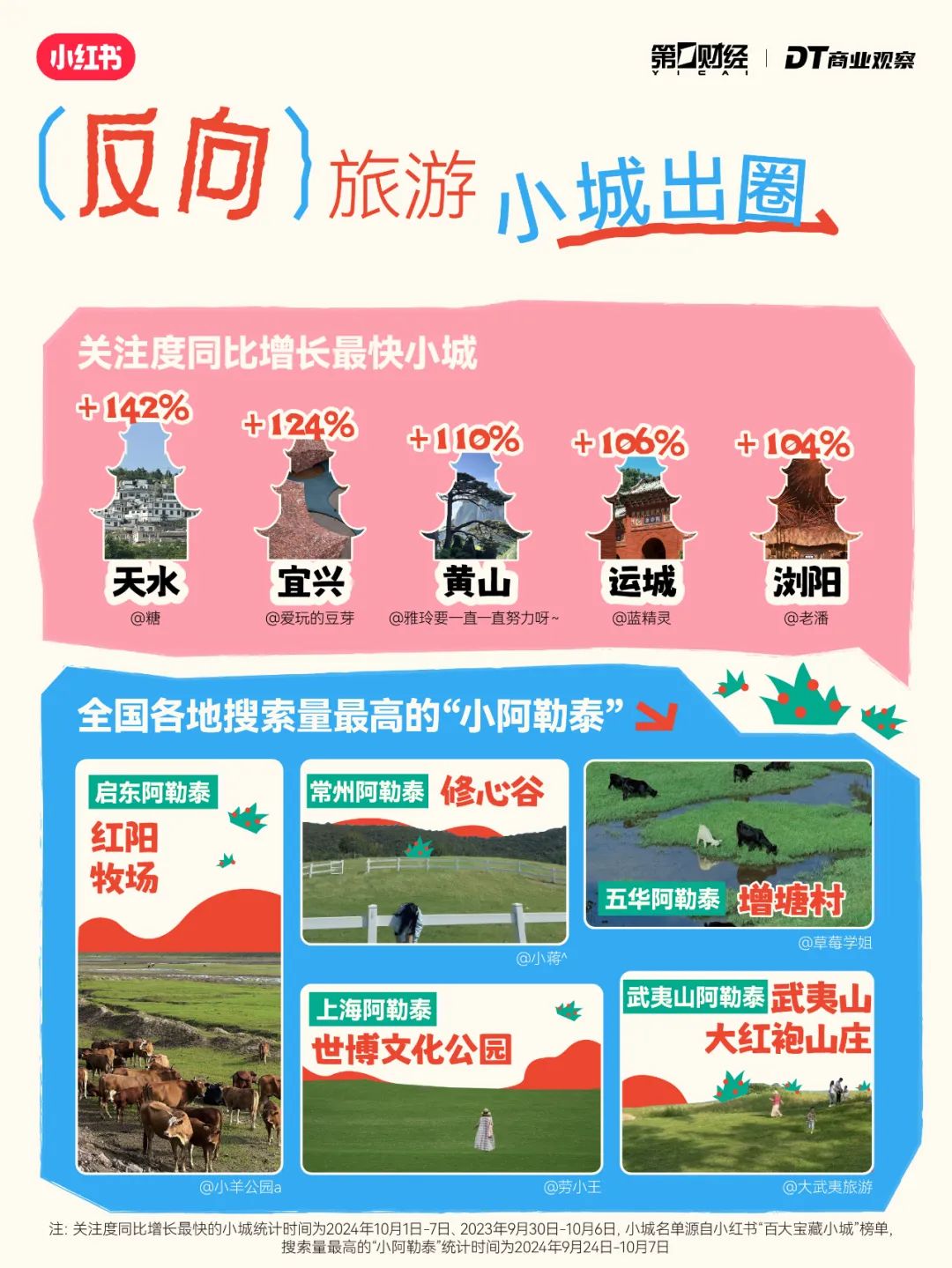 國慶期間,小紅書上關(guān)注度同比增長最快的小城分別是天水、宜興、黃山、運城和瀏陽。