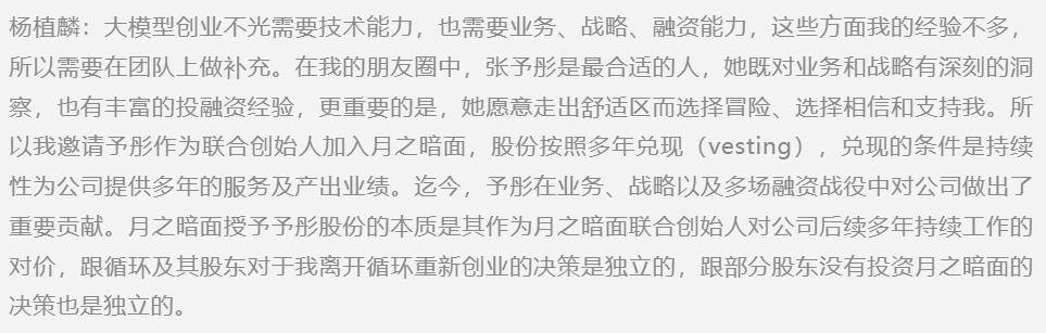 “我邀請予彤作為聯(lián)合創(chuàng)始人加入月之暗面,股份按照多年兌現(xiàn)(vesting),兌現(xiàn)的條件是持續(xù)性為公司提供多年的服務(wù)及產(chǎn)出業(yè)績。”他寫道。