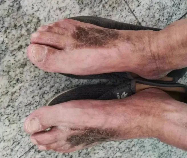 半個月后,他的靜脈曲張并沒有任何好轉(zhuǎn)的跡象,反而小腿皮膚越來越發(fā)紅發(fā)暗,越來越腫,同時還瘙癢難耐,腳上甚至出現(xiàn)了破潰,留下了一大塊“黑斑”,就像燒焦了一般。