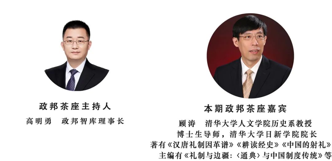 本期政邦茶座嘉賓:顧濤 清華大學(xué)人文學(xué)院歷史系教授,博士生導(dǎo)師,清華大學(xué)日新學(xué)院院長。研究偏重于中國制度史、經(jīng)學(xué)史、邊疆史、《通典》研究等。先后獲得南京大學(xué)學(xué)士、碩士、博士學(xué)位。著有《漢唐禮制因革譜》《禮學(xué)翠微》《耕讀經(jīng)史》《中國的射禮》等,主編有《禮制與邊疆:〈通典〉與中國制度傳統(tǒng)》等。