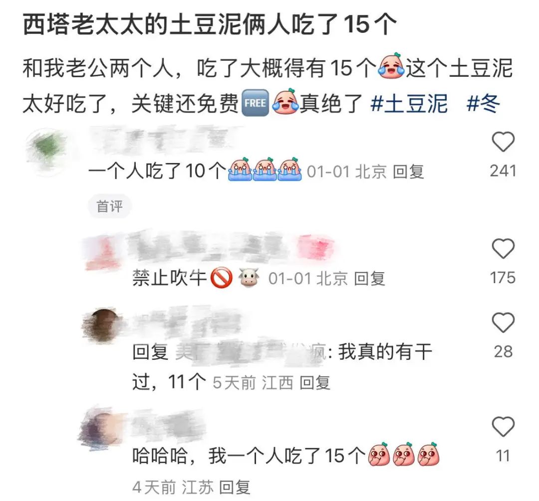 在社交平臺上,金老太最火的是免費土豆泥,有人一次最多吃16個,有人外帶打包一滿盒。所謂“西塔老太太最的不是烤肉,而是免費的土豆泥”,不少測評博主放出豪言:去西塔老太太為的就是這細(xì)膩濃郁的土豆泥。