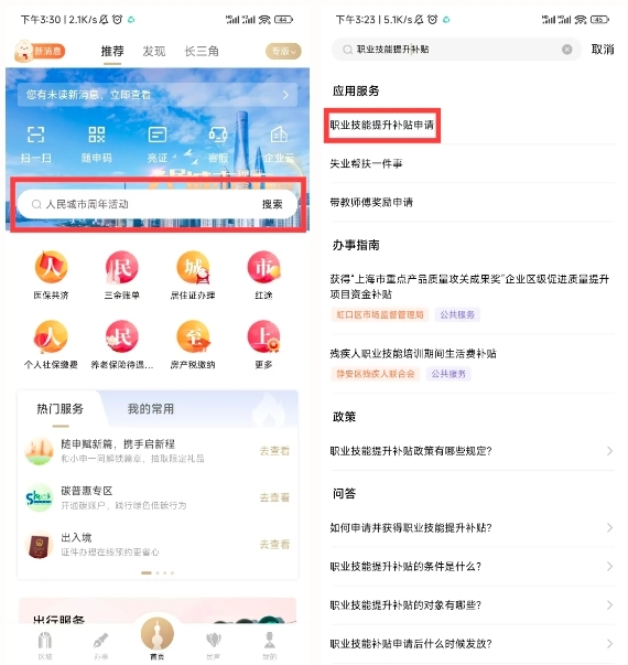 1、可通過“隨申辦市民云”APP首頁搜索關(guān)鍵詞“職業(yè)技能提升補(bǔ)貼”,選擇“職業(yè)技能提升補(bǔ)貼”服務(wù)進(jìn)行辦理。