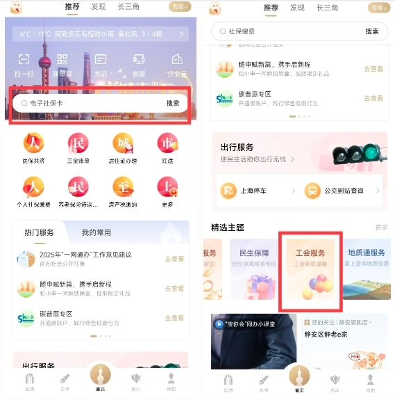 1、可通過“隨申辦市民云”APP首頁搜索關(guān)鍵詞“工會(huì)服務(wù)”,或首頁精選主題找到“工會(huì)服務(wù)”卡片點(diǎn)擊進(jìn)入即可。
