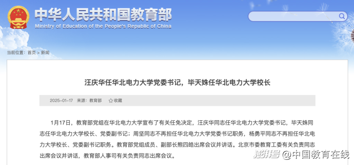 1月17日,教育部黨組在華北電力大學宣布了有關任免決定,汪慶華同志任華北電力大學黨委書記,畢天姝同志任華北電力大學校長、黨委副書記;周堅同志不再擔任華北電力大學黨委書記職務,楊勇平同志不再擔任華北電力大學校長、黨委副書記職務。教育部黨組成員、副部長熊四皓出席會議并講話。北京市委教育工委有關負責同志出席會議并講話,教育部人事司有關負責同志出席會議。