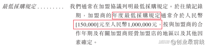 「創(chuàng)業(yè)最前線」注意到,八馬茶業(yè)和加盟商之間是買斷關系,通常在交付產(chǎn)品前,加盟商需全額支付貨款,而年度最低采購規(guī)定通常介于15萬元至100萬元之間。