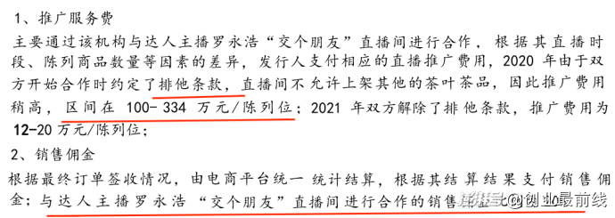 例如,2020年,在與羅永浩直播間合作時約定了排他條款,直播間不允許上架其他的茶葉茶品,推廣費用高達100萬至334萬元/陳列位。不僅如此,羅永浩直播間還要拿走20%的銷售傭金。