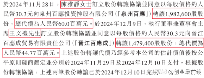 2024年11月,泉州百應從陳雅靜手中收購198.26萬股八馬茶業(yè)股份,耗資6000萬元。而陳雅靜正是王文彬之妻、周士淵的岳母,泉州百應則是周永偉家族實控的企業(yè)。