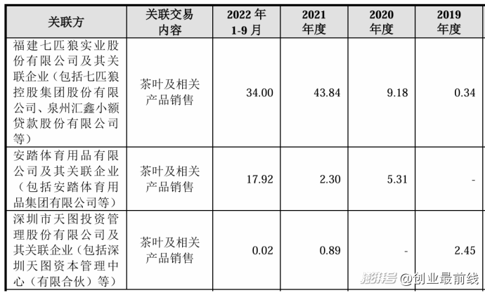 招股書顯示,安踏、七匹狼均曾為八馬茶業(yè)的業(yè)績做過貢獻。2020年至2022年9月,七匹狼、安踏每年都從八馬茶業(yè)采購茶葉及相關產(chǎn)品,年采購金額在2萬元至45萬元之間不等。