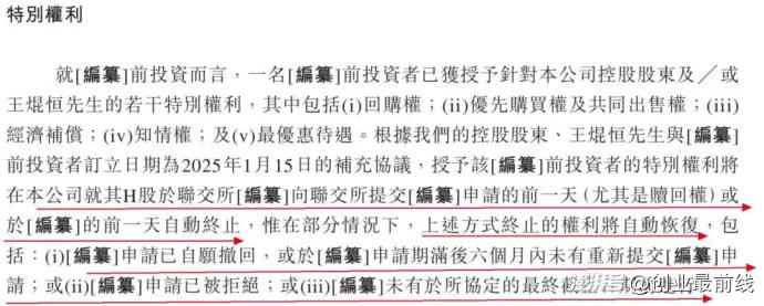 招股書顯示,公司一位投資者擁有回購權(quán)。于2025年1月15日,公司控股股東、王焜恒簽署補充協(xié)議,上述投資者擁有的贖回權(quán)在遞表港交所前一天終止,但倘若出現(xiàn)自愿撤回上市申請、上市申請已被拒絕等情況,贖回權(quán)將自動恢復。