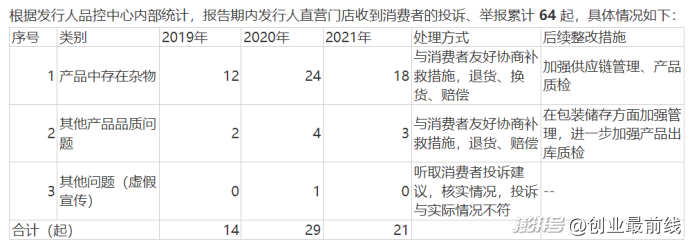 但沒有將產(chǎn)品牢牢把握在自己手中的弊端隨之而來——2019年至2021年,公司直營門店收到消費者投訴、舉報64起。其中,63起涉及產(chǎn)品質(zhì)量問題,包括產(chǎn)品中有雜物和其他產(chǎn)品品質(zhì)問題。