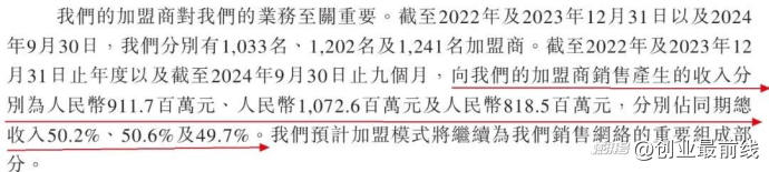2022年至2024年9月,公司實現(xiàn)收入18.18億元、21.22億元及16.47億元。其中,向加盟商銷售產(chǎn)生的收入分別為9.12億元、10.73億元及8.19億元,占同期總收入的50.2%、50.6%及49.7%。