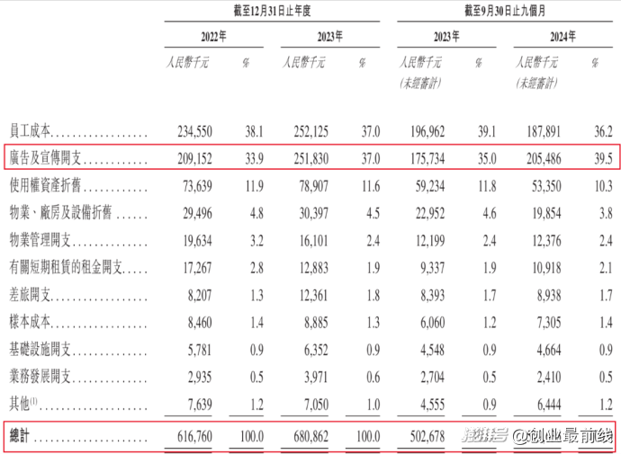 招股書顯示,2022年至2024年9月,其銷售及營銷開支分別為6.17億元、6.81億元及5.20億元。其中,用于廣告與宣傳的開支分別為2.09億元、2.52億元及2.05億元,累計高達6.66億元。