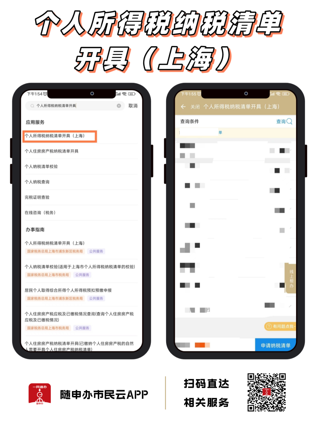 “隨申辦市民云”APP【個人所得稅納稅清單開具】,支持在線開具納稅清單。