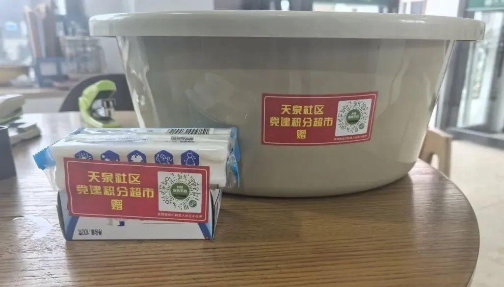 線下,天泉社區(qū)則建立“黨建積分超市”,將積分制管理實體化、具體化。居民通過參與線下的人居環(huán)境整治活動,如清理垃圾、綠化美化、宣傳環(huán)保知識等,可以獲得額外的積分。這些積分可以在“黨建積分超市”中兌換各種實用的生活用品和服務(wù),如洗臉盆、香皂、肥皂套裝等,讓居民在參與環(huán)境治理的同時,也能到實實在在的福利。