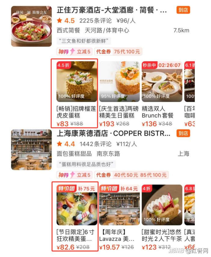 根據(jù)分享,在一些團(tuán)購(gòu)平臺(tái)上,上??等R德酒店原價(jià)208元“6寸生日蛋糕”,團(tuán)購(gòu)價(jià)83元;廣州正佳萬(wàn)豪酒店原價(jià)188元“6寸榴蓮蛋糕”團(tuán)購(gòu)只要83元;廣州瑰麗酒店每月推出一款“288元2磅”的優(yōu)惠價(jià)蛋糕,相當(dāng)于打5折……