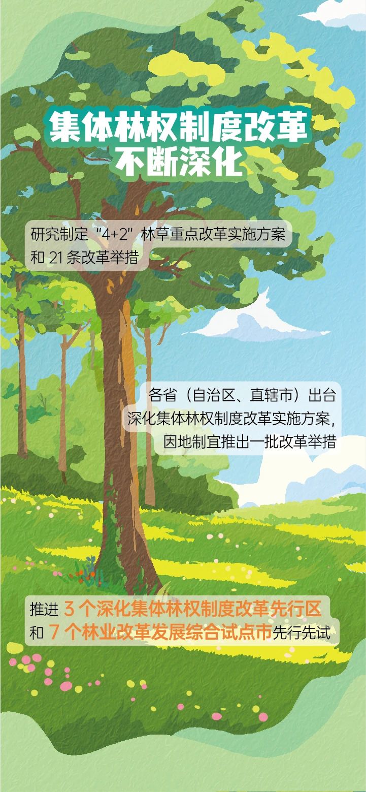 研究制定“4+2”林草重點(diǎn)改革實(shí)施方案和21條改革舉措。落實(shí)《深化集體林權(quán)制度改革方案》,明確穩(wěn)定林地長(zhǎng)期承包關(guān)系、推進(jìn)林權(quán)流轉(zhuǎn)、培育林業(yè)適度規(guī)模經(jīng)營(yíng)主體等10項(xiàng)措施。召開(kāi)深化集體林權(quán)制度改革現(xiàn)場(chǎng)推進(jìn)會(huì),在全國(guó)生態(tài)日發(fā)布改革最新成果。各?。ㄗ灾螀^(qū)、直轄市)出臺(tái)深化集體林權(quán)制度改革實(shí)施方案,因地制宜推出一批改革舉措。印發(fā)規(guī)范高效做好林權(quán)類不動(dòng)產(chǎn)登記工作的通知,妥善化解林權(quán)登記歷史遺留問(wèn)題。推進(jìn)3個(gè)深化集體林權(quán)制度改革先行區(qū)和7個(gè)林業(yè)改革發(fā)展綜合試點(diǎn)市先行先試,在河北省保定市唐縣等21個(gè)縣(市、區(qū))開(kāi)展林權(quán)登記提質(zhì)增效試點(diǎn),建設(shè)服務(wù)集體林權(quán)制度改革試點(diǎn)國(guó)有林場(chǎng)220個(gè)。福建省創(chuàng)新推出林票,江西省建立林業(yè)經(jīng)營(yíng)收益權(quán)證等新機(jī)制,重慶市探索出臺(tái)林業(yè)金融政策。